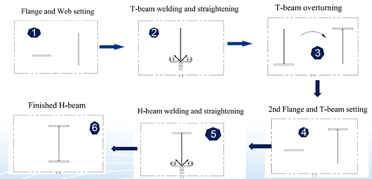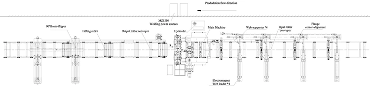 Ang ilang mga customer ay maaaring kailanganin upang madagdagan ang output ng theproduction, kailangan nila ng isang linya ng hinang upang binubuo ng 2 hanay ng istasyon ng welding.Ang unang istasyon ng hinang para sa pag-welding ng 1st flange at web upang makabuo ng isang t beam, ang ika-2 para sa pag-welding ng welded t-beam at 2nd flange upang mabuo ang isang h beam.