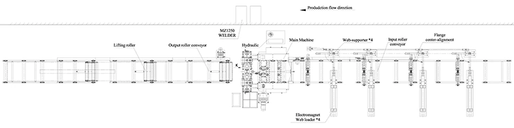Batay sa karaniwang mga linya ng welding ng 3-in-1 h beam, may magdagdag ng isang hanay ng mga web-loader, kung saan ang mga 4 na PC ng magnet loading arm at 4pcs ng web supporter.on bawat web loading arm mayroong 2pcs ng magnet para sa paghawak ng bakal na web plate.